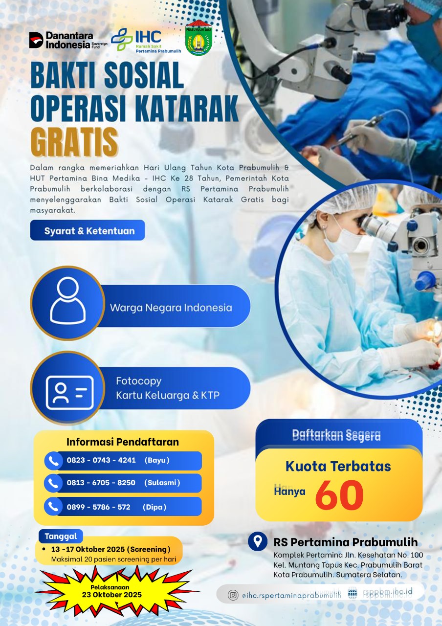 Dalam rangka memeriahkan Hari Ulang Tahun Kota Prabumulih dan HUT Pertamina Bina Medika - IHC ke 28 Tahun. Pemerintah Kota Prabumulih berkolaborasi dengan RS Pertamina Prabumulih menyelenggarakan. Bakti Sosial Operasi Katarak. Gratissss bagi masyarakat Sy
